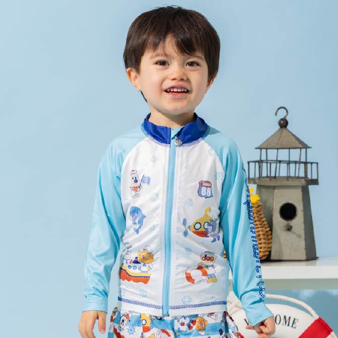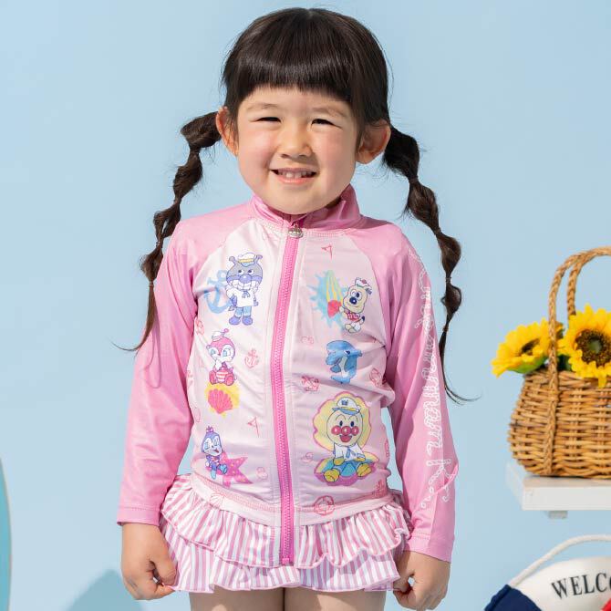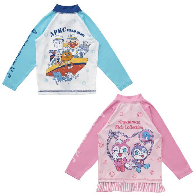 マリンスタイルのアンパンマンたちがプリントされたラッシュガード☆UVカットができるから、日焼け防止にも効果を発揮!別売りの「マリン柄スイムパンツ」・「シェル柄水着」とのセットアップもおすすめだよ♪マリン柄ラッシュガード/シェル柄ラッシュガード価格:各5,280(税込)サイズ:90㎝/100㎝/110㎝/120㎝カラー:「マリン柄ラッシュガード」ブルー/「シェル柄ラッシュガード」ピンク