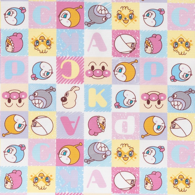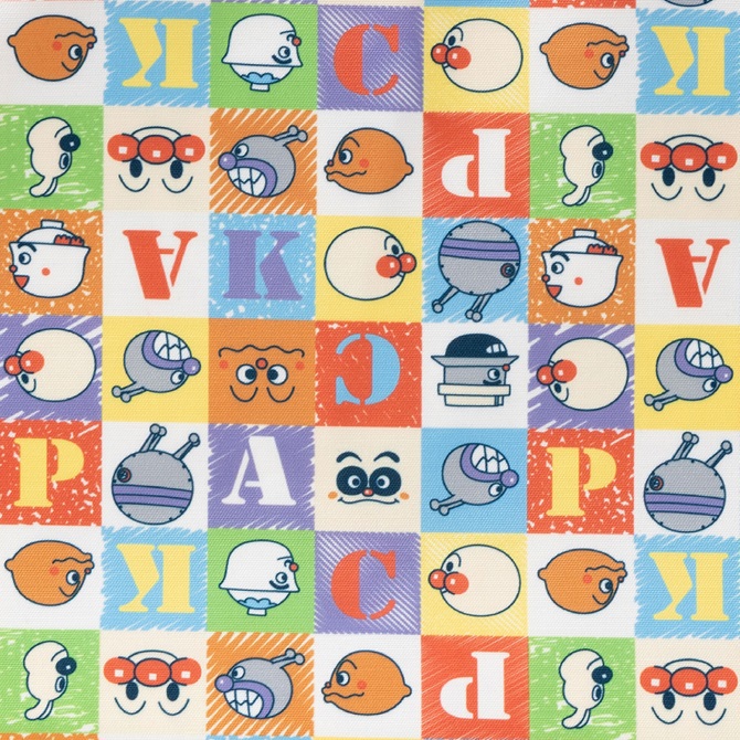 アンパンマンとなかまたちのお顔が、カラフルなブロック風にデザインされた総柄の巾着。