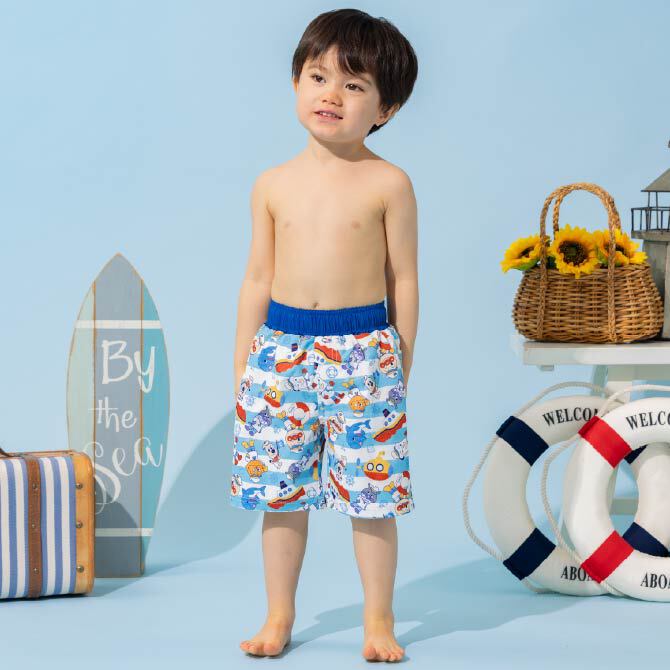 マリンのお洋服を着たアンパンマンたちのボーダー総柄サーフパンツ!バックのポケット部分のワッペン風プリントデザインもポイントだよ♪別売りの「マリン柄ラッシュガード」と合わせてコーディネートしてもかっこいいね☆マリン柄スイムパンツ価格:各4,620(税込)サイズ:90㎝/100㎝/110㎝/120㎝カラー:ブルー