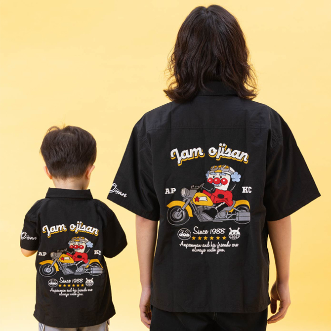人気のジャムおじさんバイクシリーズに半袖シャツが登場!!大人用はゆったりシルエットで、ユニセックスで着用可能♪親子でおそろいコーディネートもおすすめだよ!ジャムおじさんバイク刺繍シャツ価格:子供 9,900円(税込) 大人 15,400円(税込)サイズ:子供 90㎝/100㎝/110㎝/120㎝ 大人 M/L/LL/3Lカラー:ブラック