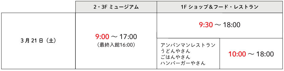 2026年3月以降の営業時間について、下記の通りお知らせいたします。<営業時間>下記の日程につきましては、営業時間を変更させていただきます。※2・3F ミュージアムへのご入館には、日時指定WEBチケットの事前購入が必要※1F ショップ&フード・レストランは入場無料