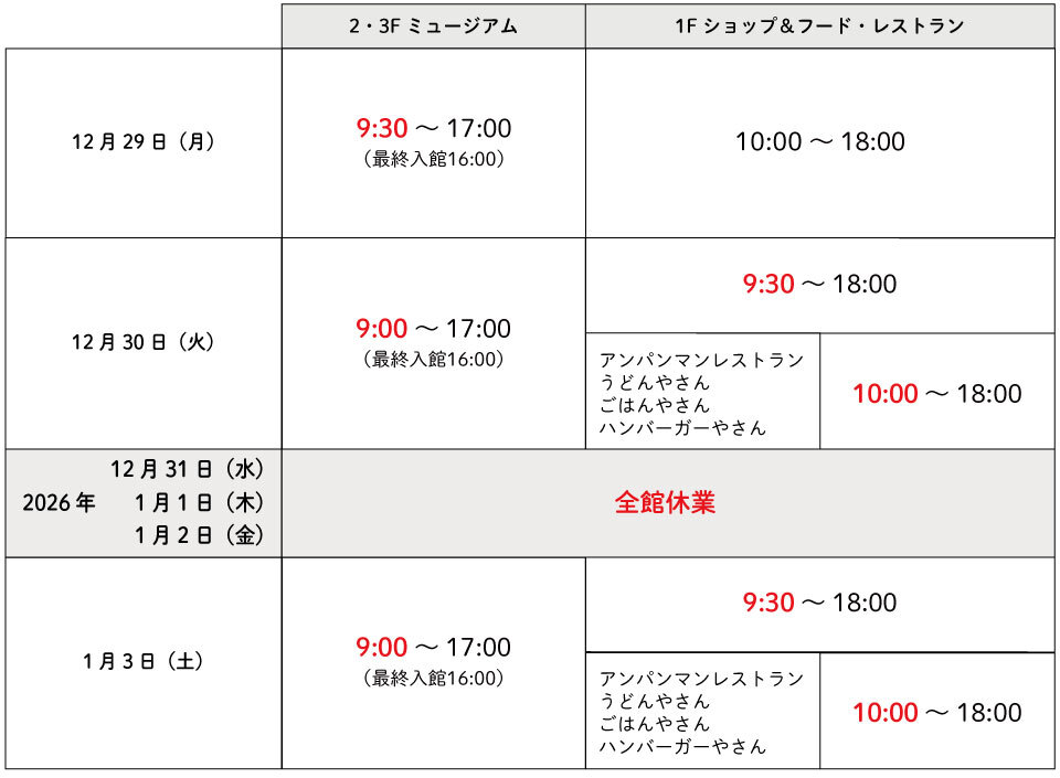 2025年12月~2026年1月の営業時間について、下記の通りお知らせいたします。<営業時間>下記の日程につきましては、営業時間を変更させていただきます。※2・3F ミュージアムへのご入館には、日時指定WEBチケットの事前購入が必要※1F ショップ&フード・レストランは入場無料2025/11/10 更新