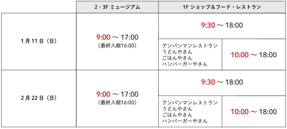 2026年1月~2月の営業時間について、下記の通りお知らせいたします。<営業時間>下記の日程につきましては、営業時間を変更させていただきます。※2・3F ミュージアムへのご入館には、日時指定WEBチケットの事前購入が必要※1F ショップ&フード・レストランは入場無料2026年1月4日更新
