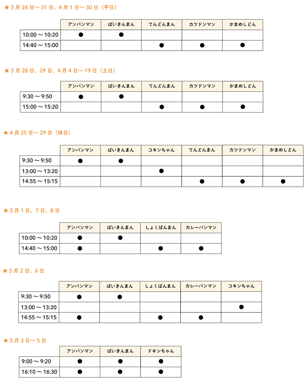 3Fミュージアムで、アンパンマンたちとタッチや、ごあいさつできるキャラクターグリーティングを開催中。通常、開催時間は不定期ですが、以下の日時はアンパンマンたちや てんどんまん・カツドンマン・かまめしどんが登場します。<場所> 3F パンこうじょう前ひろば※2・3Fミュージアムへのご入館は、日時指定WEBチケットの事前購入が必要です<登場するキャラクター>※上記日時以外にも不定期に実施いたします※状況により変更となる場合があります※グリーティング中は、スタッフの指示に従ってください