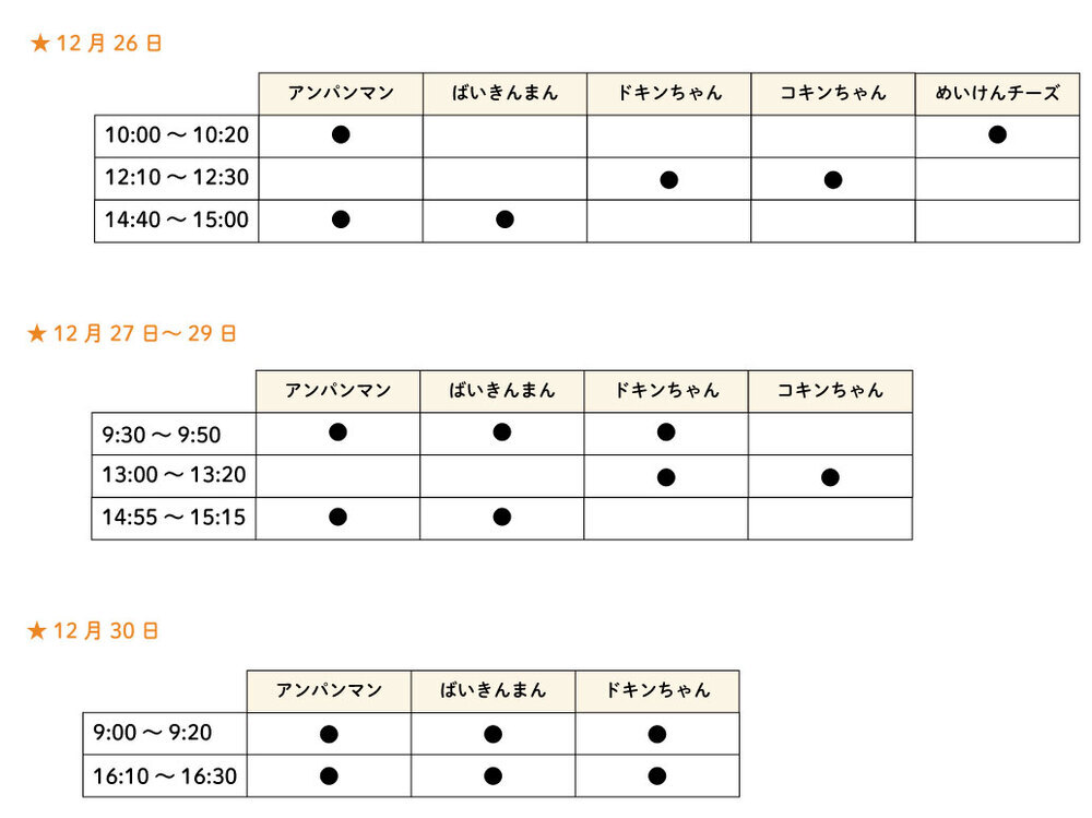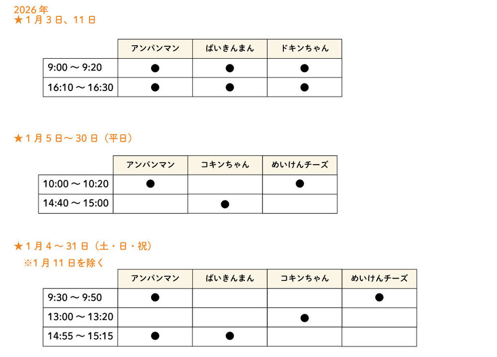 3Fミュージアムで、アンパンマンたちとタッチや、ごあいさつできるキャラクターグリーティングを開催中。通常、開催時間は不定期ですが、以下の日時はアンパンマンやドキンちゃん・コキンちゃんたちが登場します。<場所> 3F パンこうじょう前ひろば※2・3Fミュージアムへのご入館は、日時指定WEBチケットの事前購入が必要です<登場するキャラクター>※上記日時以外にも不定期に実施いたします※状況により変更となる場合があります※グリーティング中は、スタッフの指示に従ってください