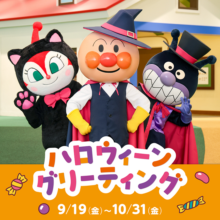 通常、開催時間は不定期ですが、9月19日~10月31日の期間は、ハロウィーンの仮装をしたアンパンマン、ばいきんまん、ドキンちゃんが登場します。
