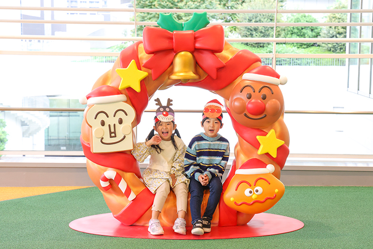 屋外ひろばには、アンパンマンたちの雪だるまやおおきなクリスマスリースのフォトスポットも登場するよ!
