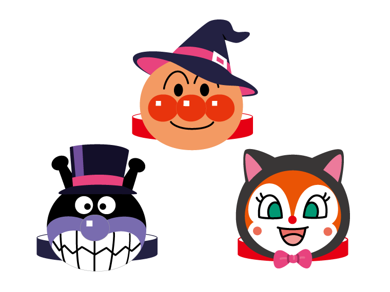 ハロウィーンの仮装をしたアンパンマン、ばいきんまん、